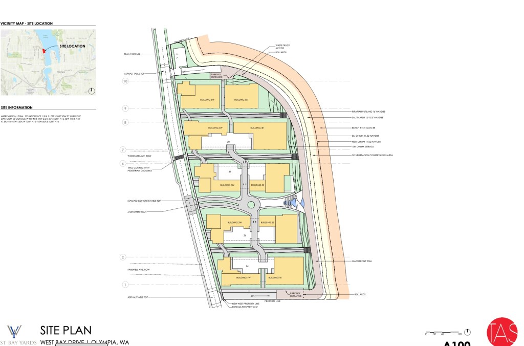 Here we go again. The proposed development at West Bay Yards has been updated and still contains five buildings and 478 units. A SEPA Determination of Non-Significance has been issued. The City’s SEPA Official determined that the anticipated impacts will be addressed by the City’s environmental regulations including the Shoreline Master Program, Critical Area regulations, Drainage Design and Erosion Control Manual, Engineering Design and Development Standards, Municipal Code and the environmental documents submitted with the project application.
