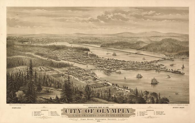 Budd Inlet is the southernmost body of water in Puget Sound. Olympia, the State Capital, lies at its southern end. The Deschutes River, now impounded by a dam that forms Capitol Lake, flows into the bay, as do a number of streams. The Port of Olympia occupies a long peninsula that divides the bay into East and West portions.